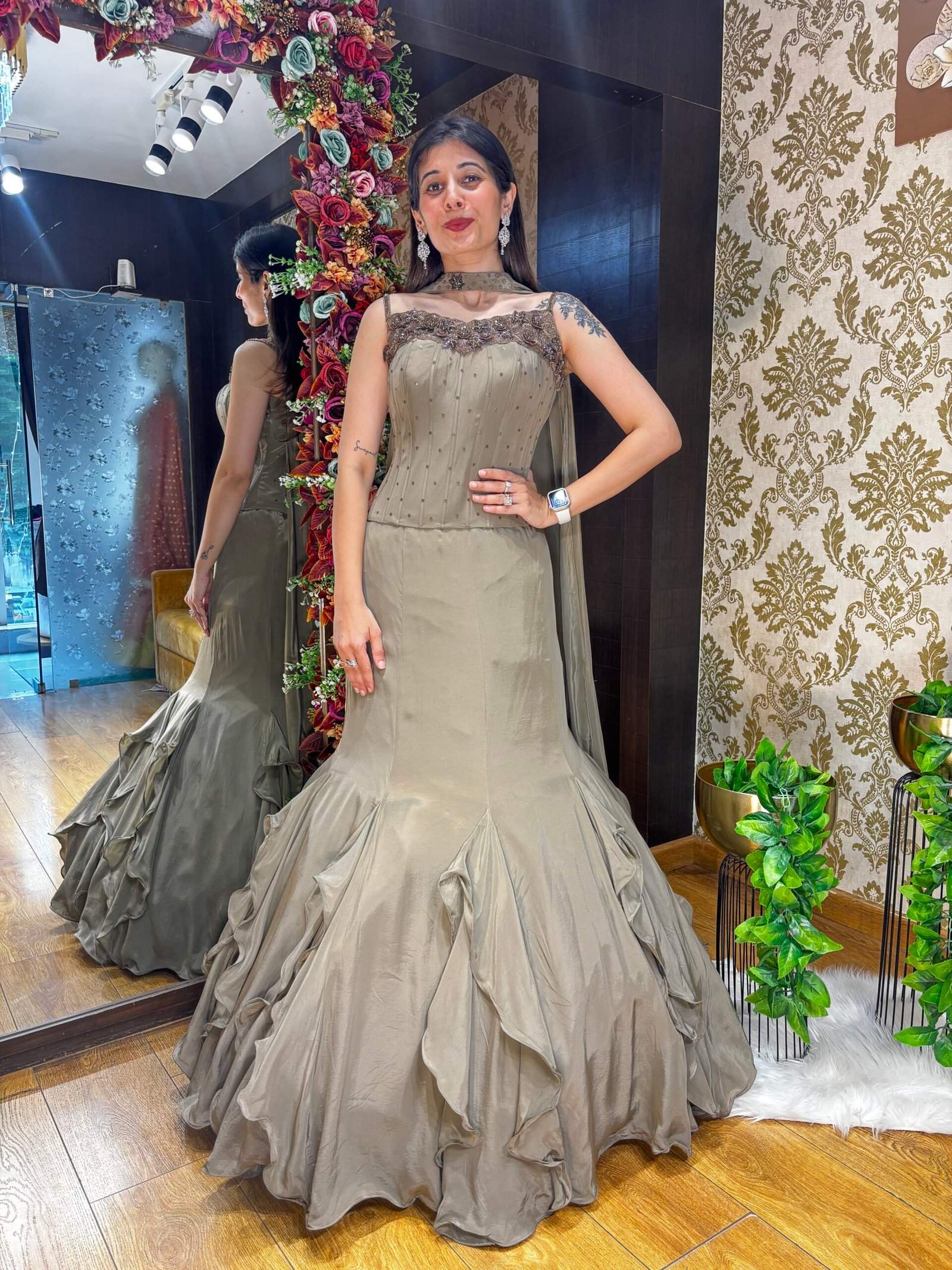 Be the first to review “AAIRA BROWN GOLD STYLISH FISH CUT SKIRT CROP TOP” Cancel reply