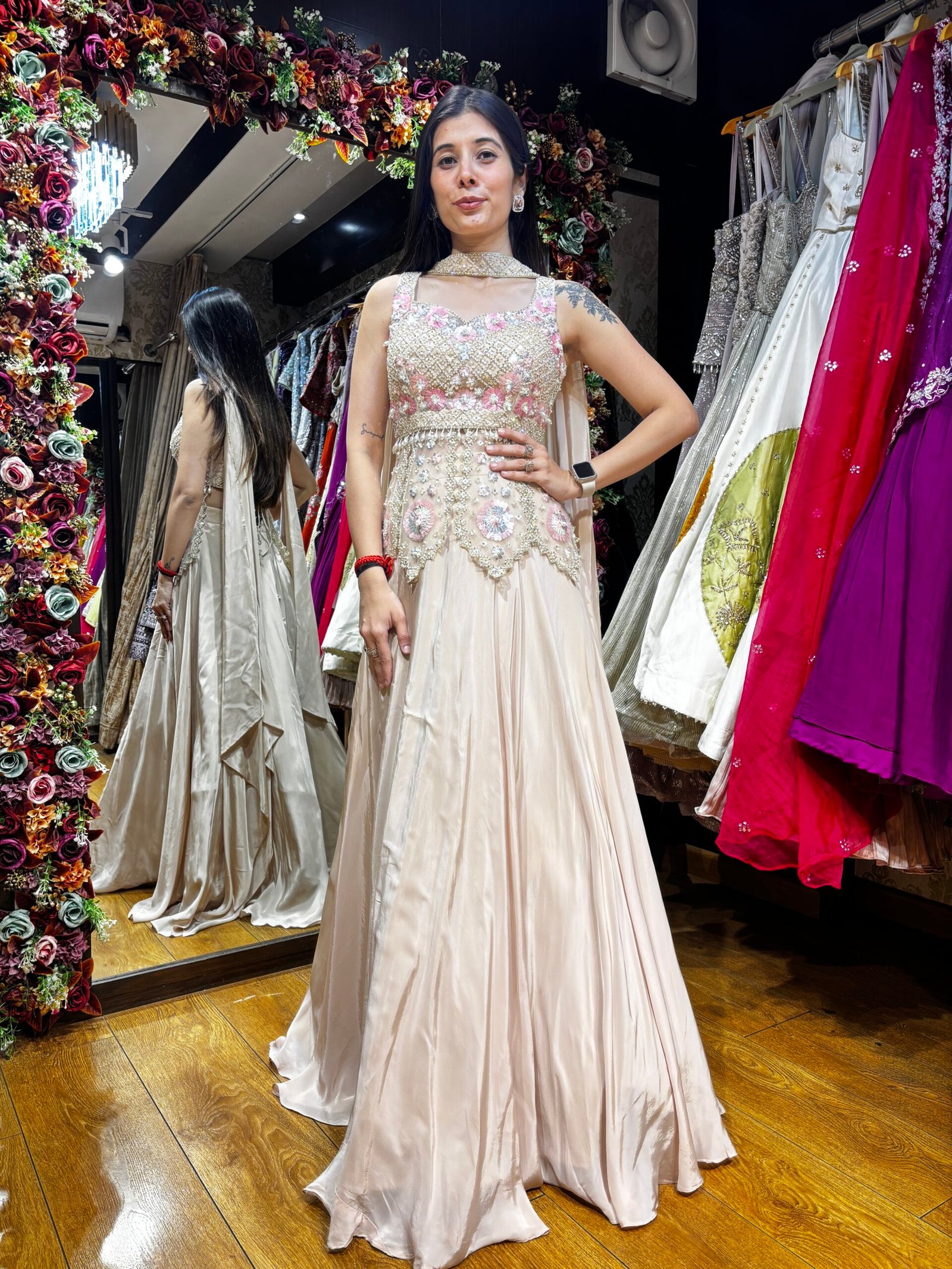 Be the first to review “BEIGE BLUSH CREPE LENGHA WITH DESIGNER PEPLUM CHOLI & NECK DUPATTA” Cancel reply