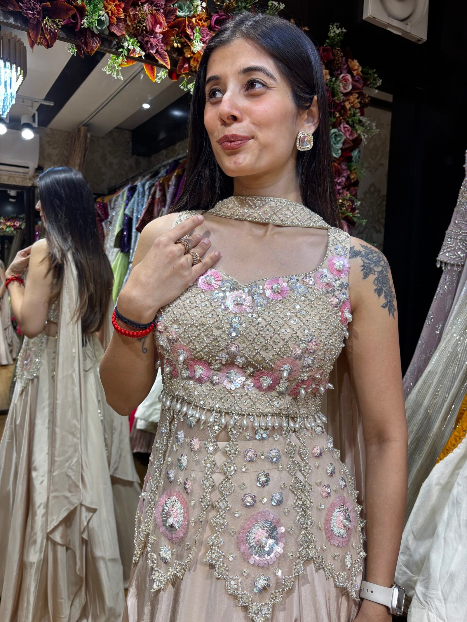 BEIGE BLUSH CREPE LENGHA WITH DESIGNER PEPLUM CHOLI & NECK DUPATTA