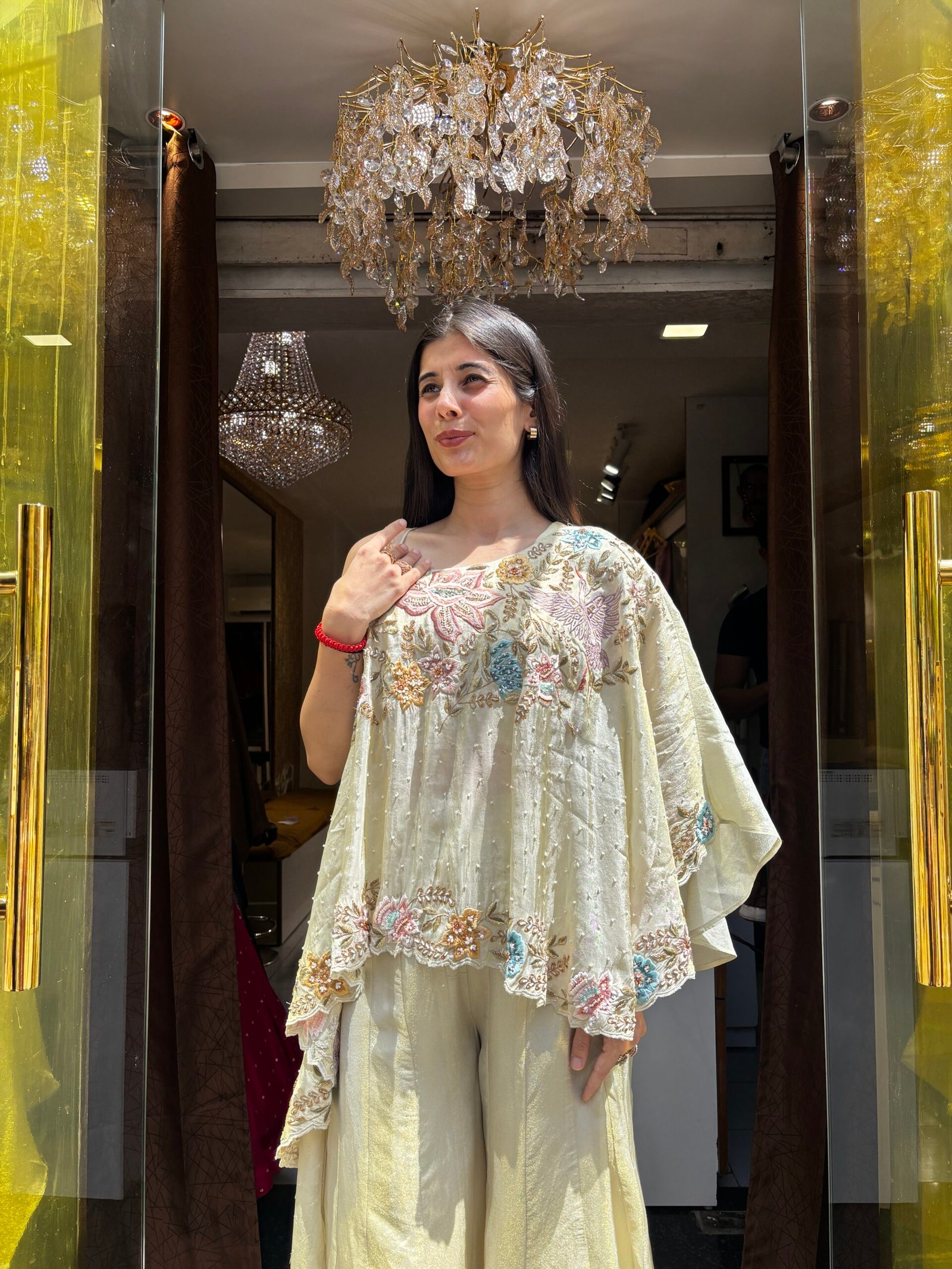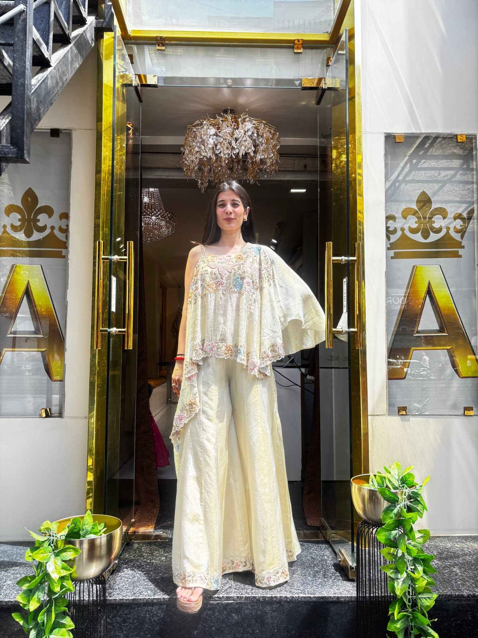 BEIGE IVORY STYLISH DIVA PLAZZO SET WITH ONE SIDE SHOULDER CAPE