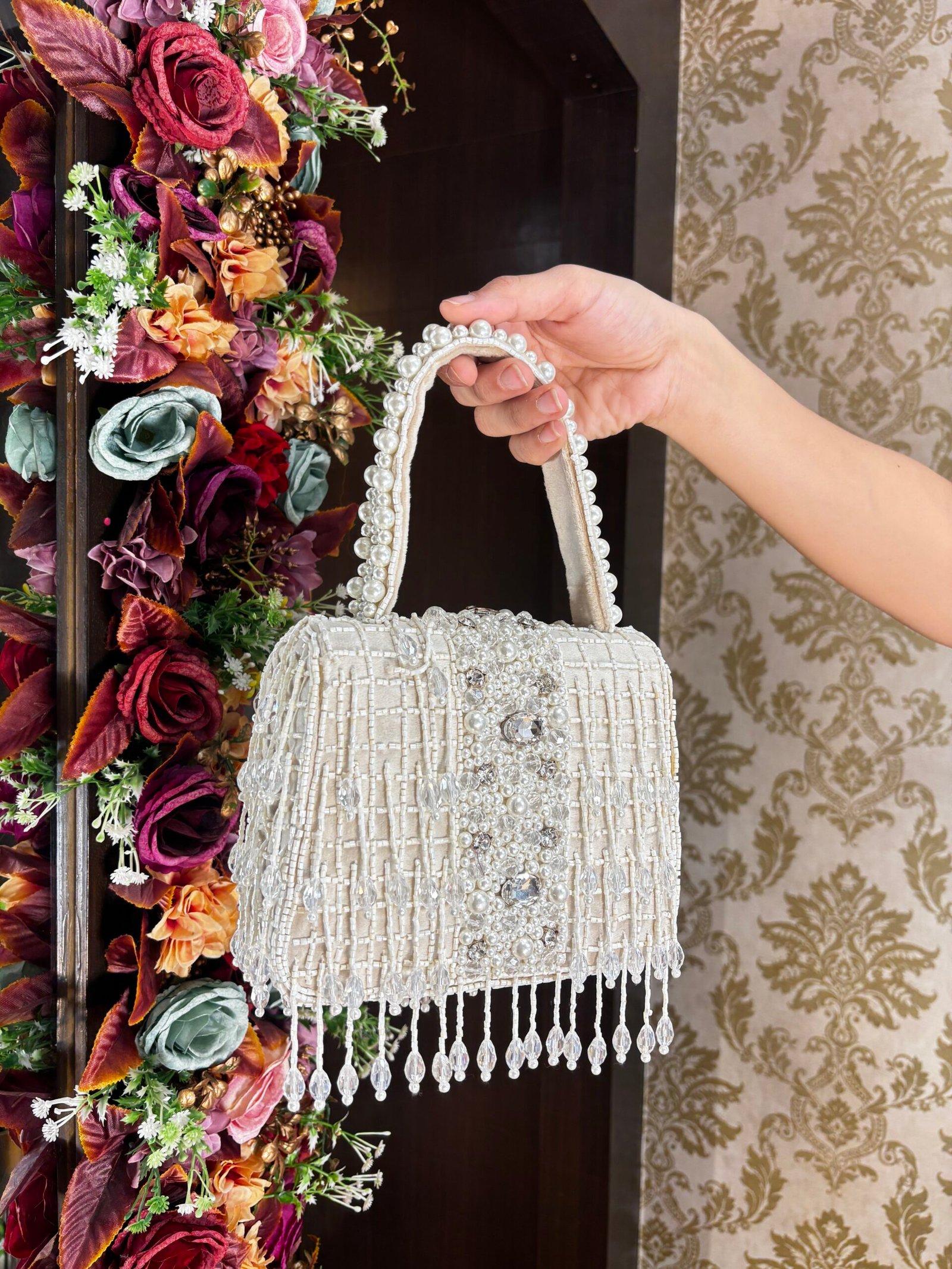 Be the first to review “IVORY DRAMATIC PEARL BOX TASSELED BAG” Cancel reply