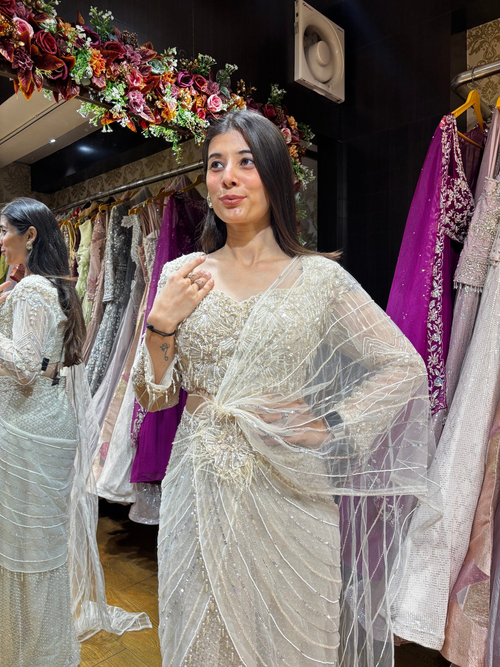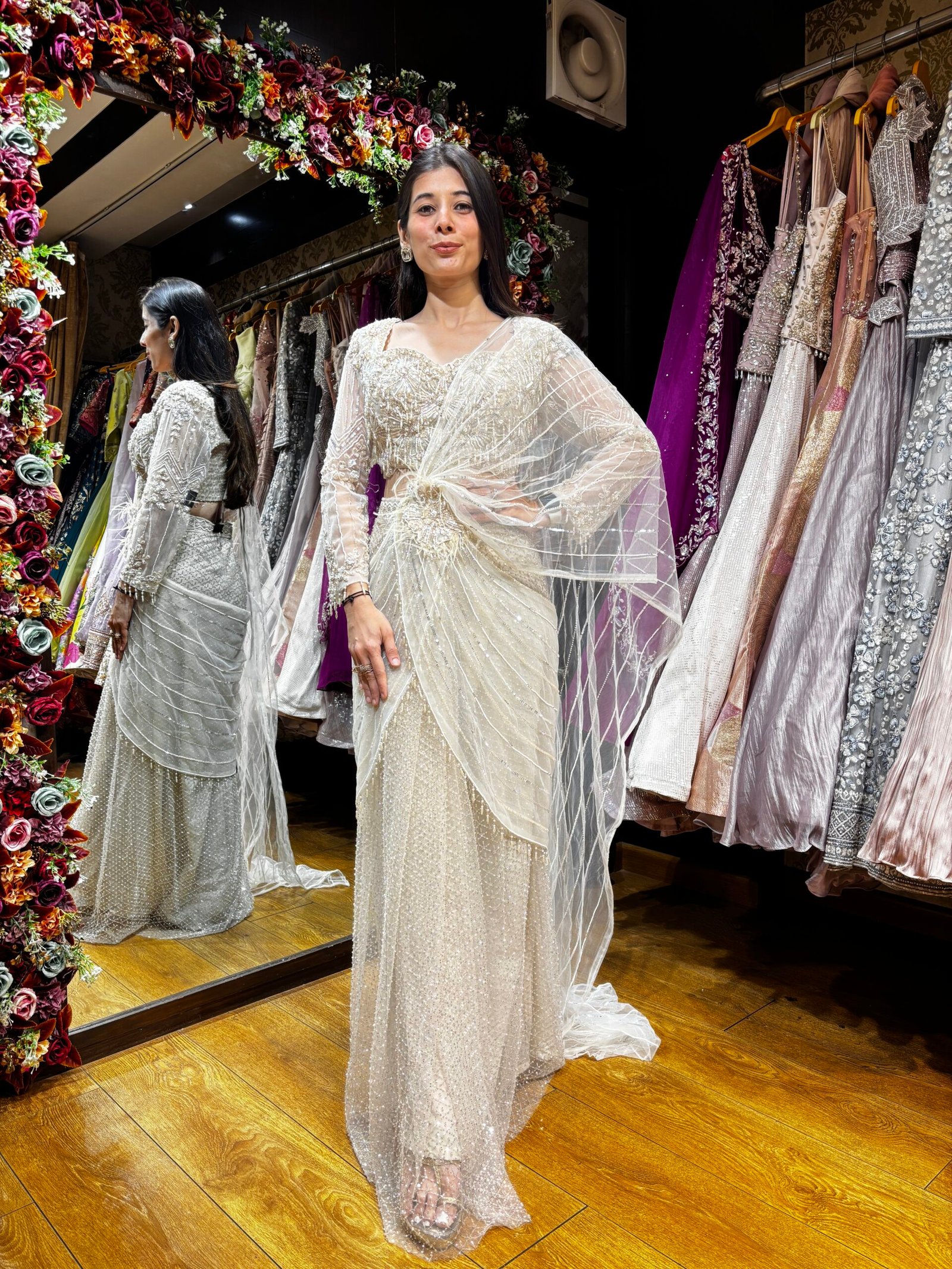 Be the first to review “IVORY STARDUST DRAPE SAREE” Cancel reply