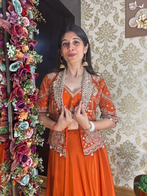 Be the first to review “MIHA ORANGE LENGHA CHOLI WITH HEAVY TRADITIONAL JACKET” Cancel reply