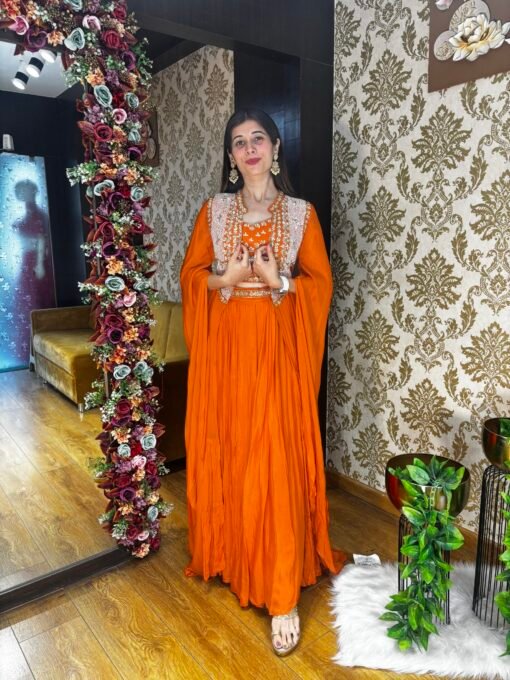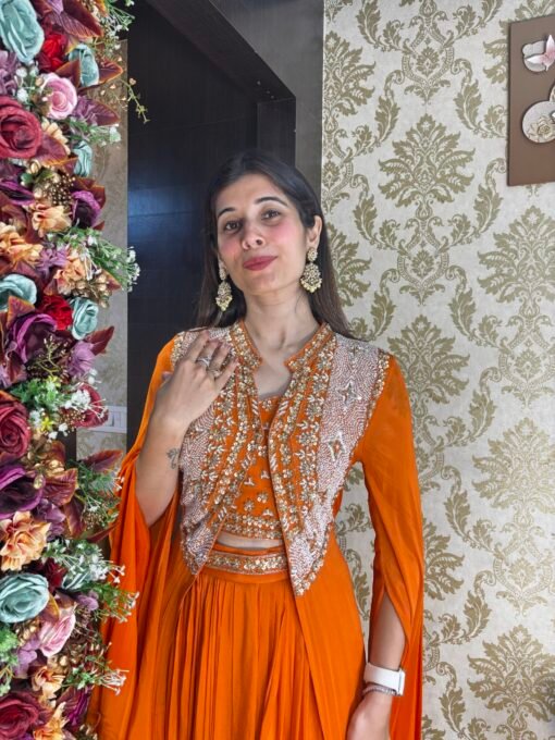 Be the first to review “MISHTI STUNNING ORANGE SKIRT WITH HEAVY CAPE & BELT” Cancel reply