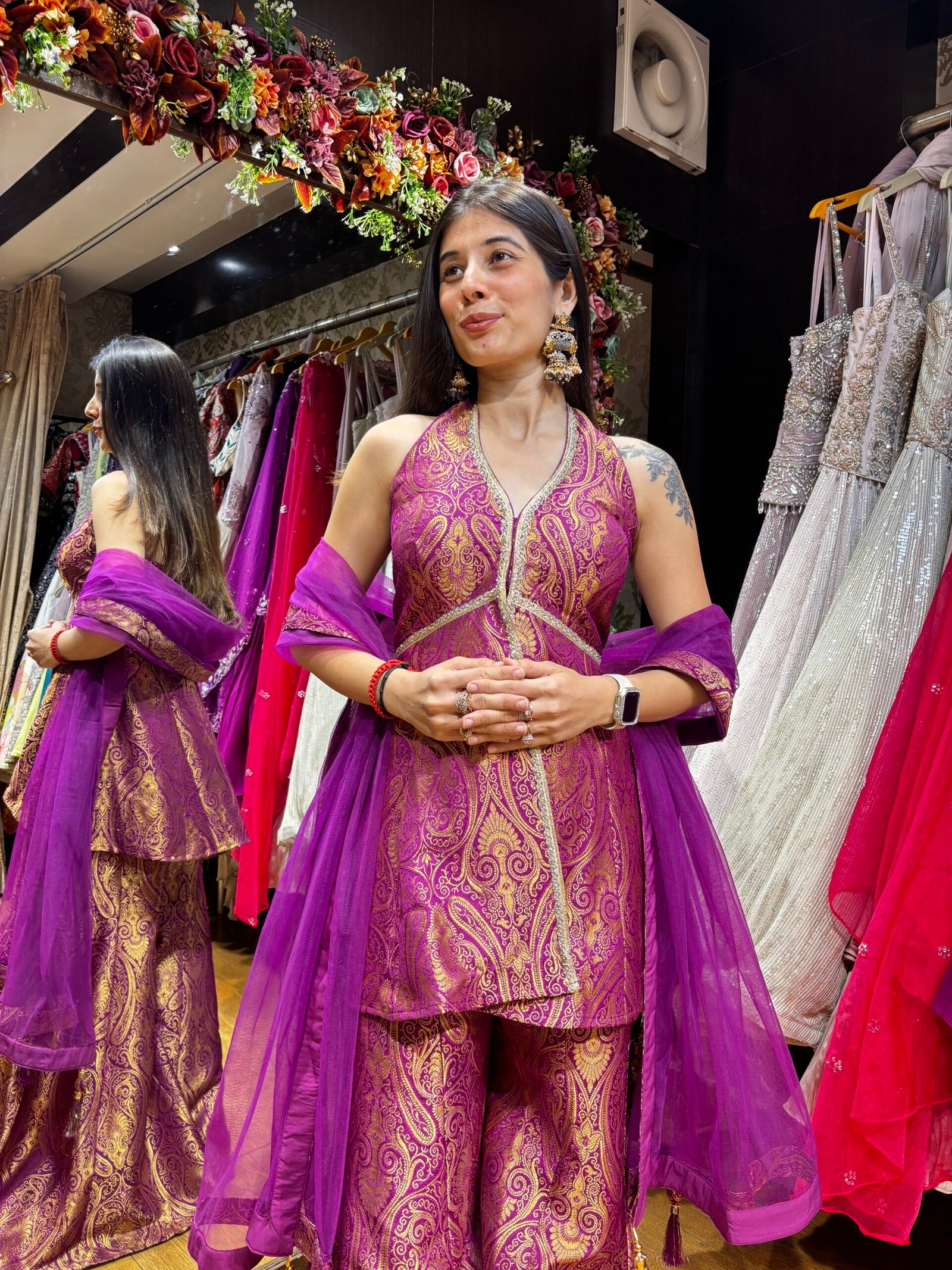 NOORANI PURPLE BELL BOTTOM BANARASI HALTER NECK PLAZZO SUIT