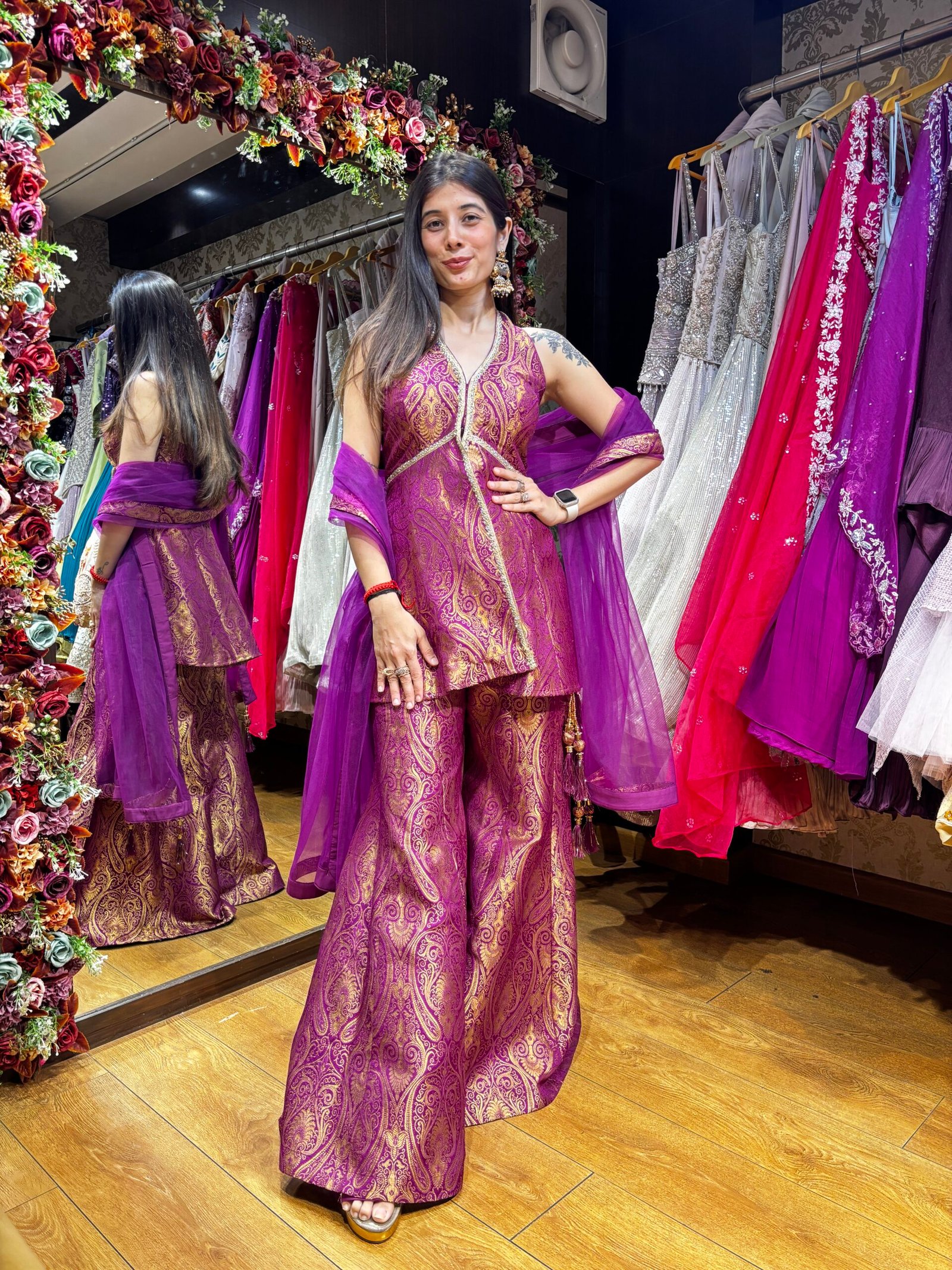 Be the first to review “NOORANI PURPLE BELL BOTTOM BANARASI HALTER NECK PLAZZO SUIT” Cancel reply