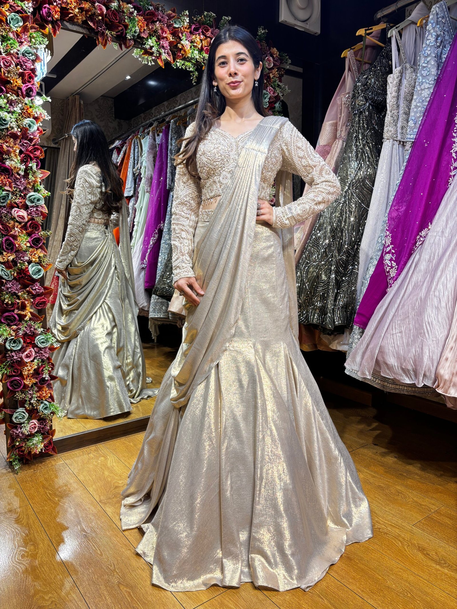 Be the first to review “PEARL GOLD LUXE FULL SLEEVES DRAPE SAREE” Cancel reply