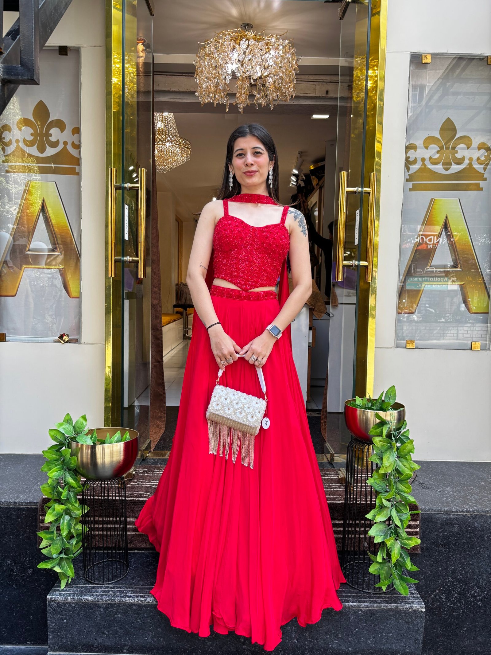 Be the first to review “RED LUXE CORSET BLOUSE WITH FLARED SKIRT AND NECK BELT DUPATTA” Cancel reply