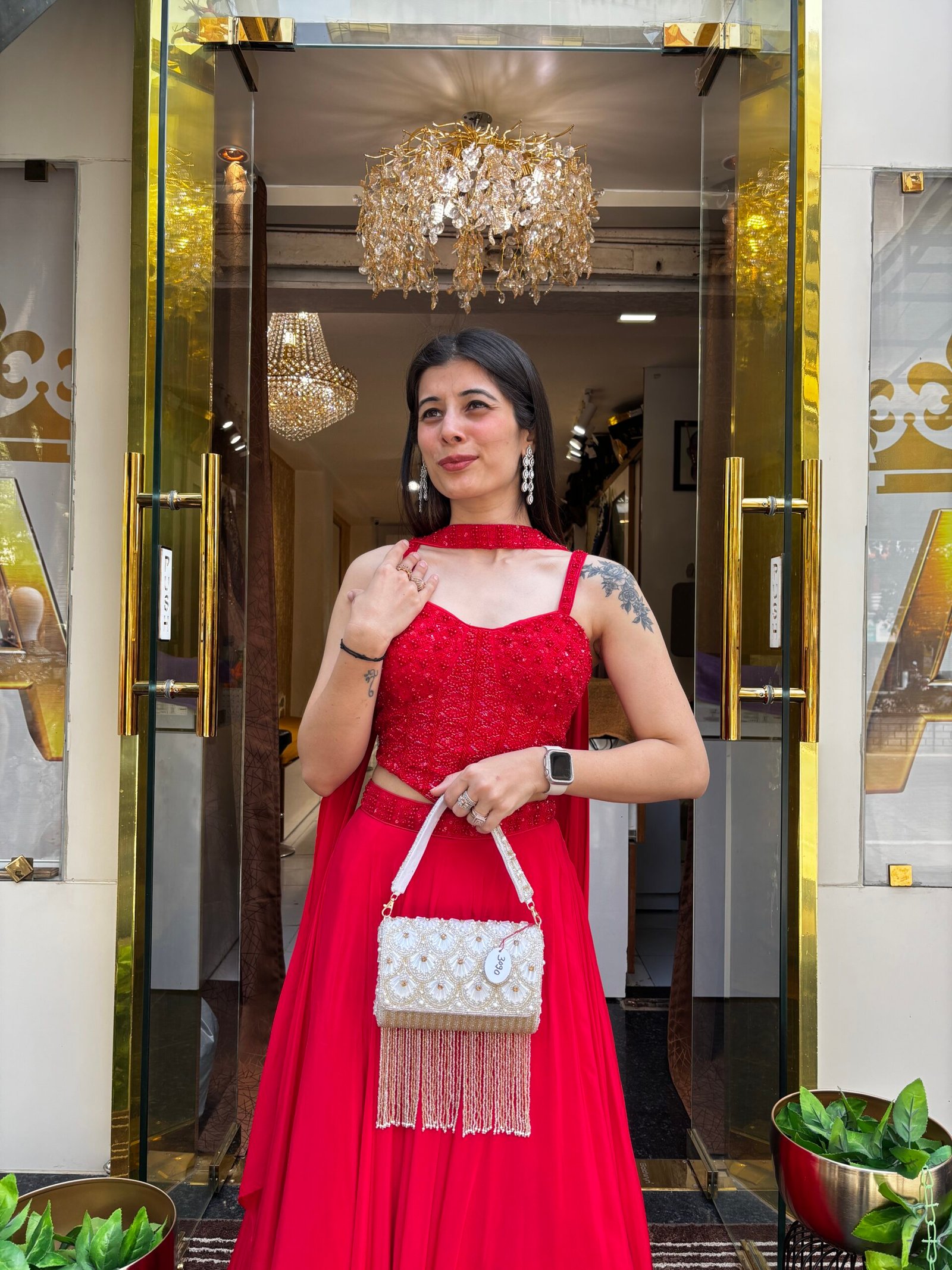 RED LUXE CORSET BLOUSE WITH FLARED SKIRT AND NECK BELT DUPATTA