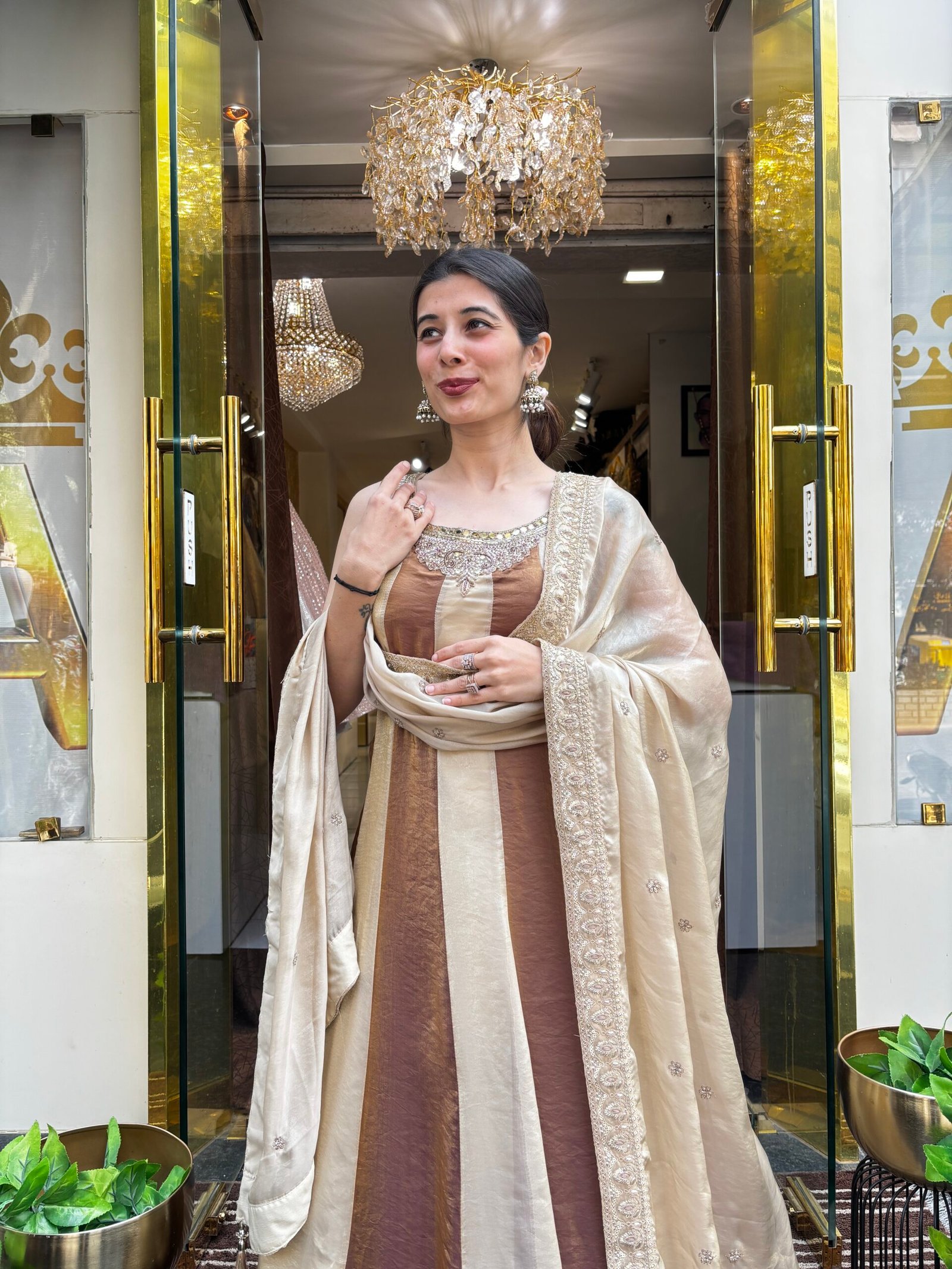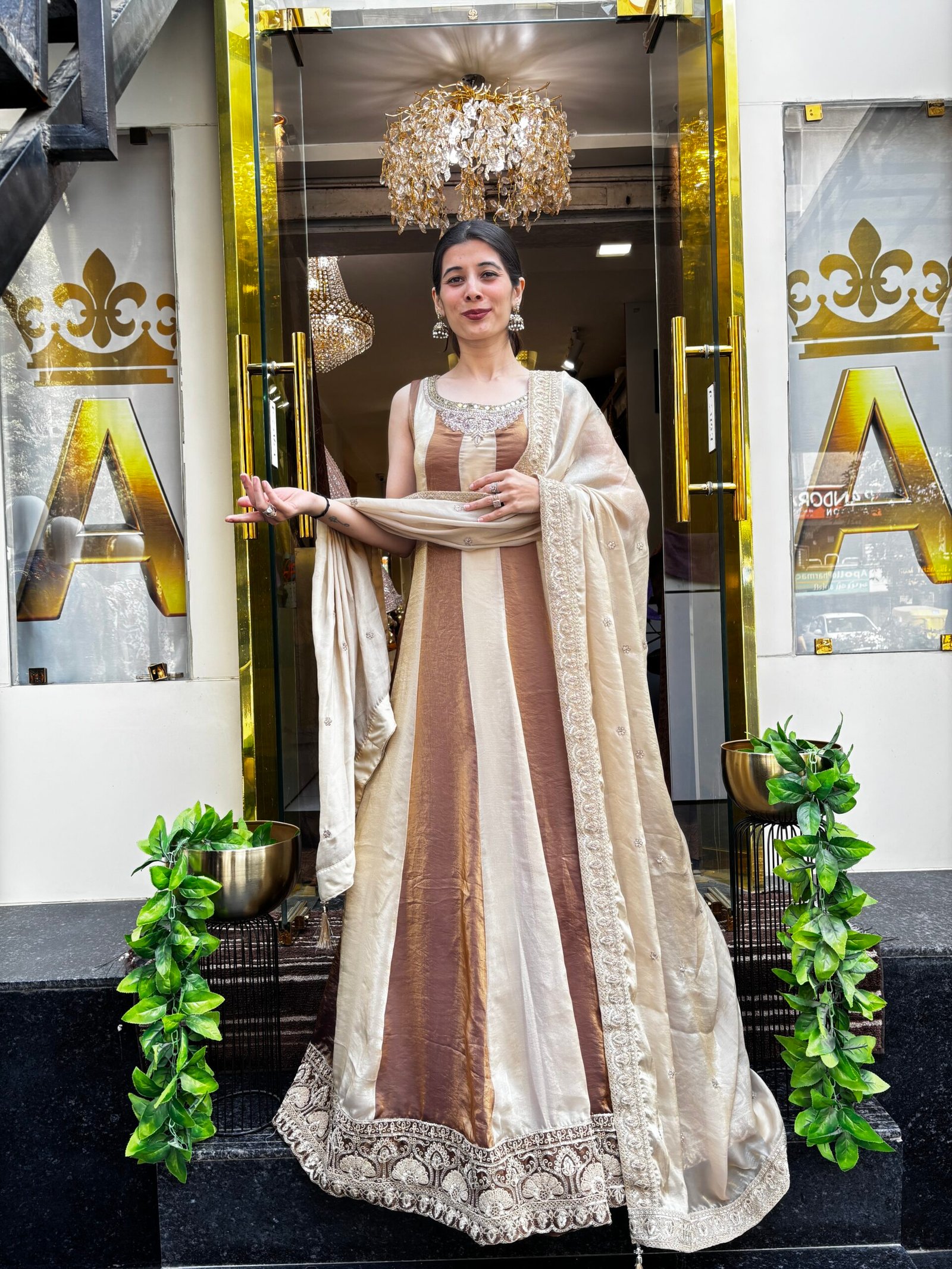 SAANVI NUDE BROWN STRIPS ANARKALI GOWN WITH DUPATTA