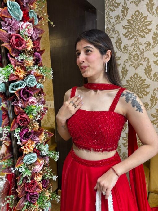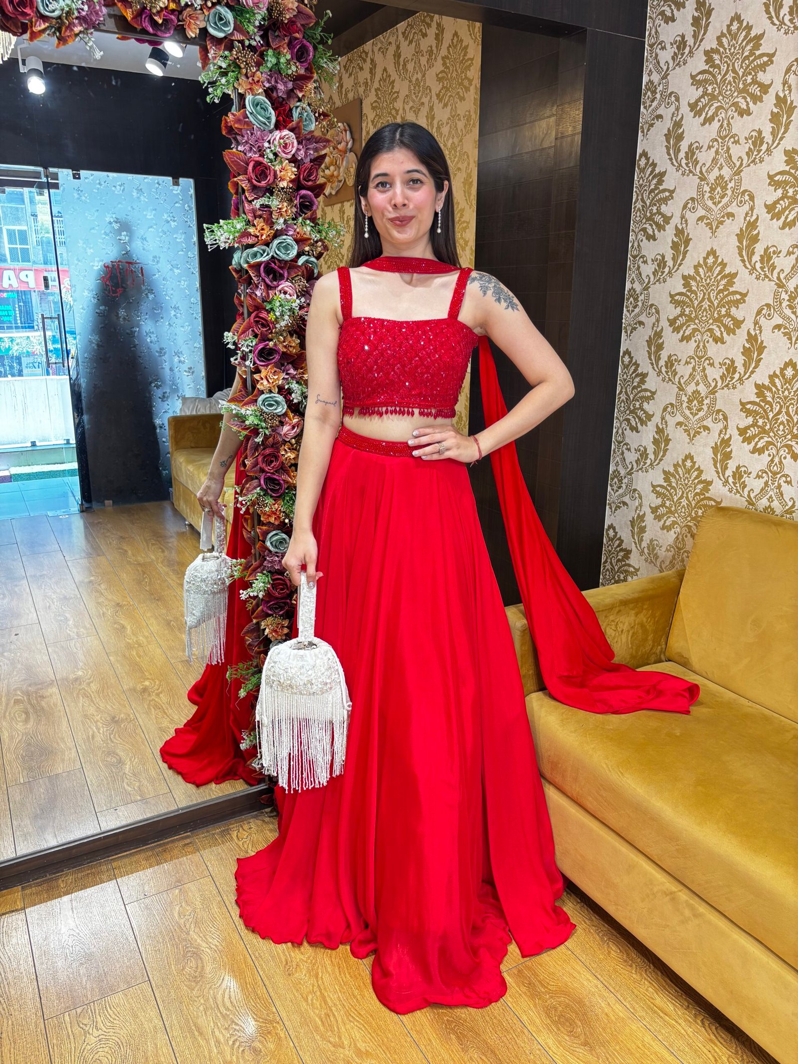 Be the first to review “STUNNING CREPE SKIRT TOP WITH NECK BELT DUPATTA-RED” Cancel reply