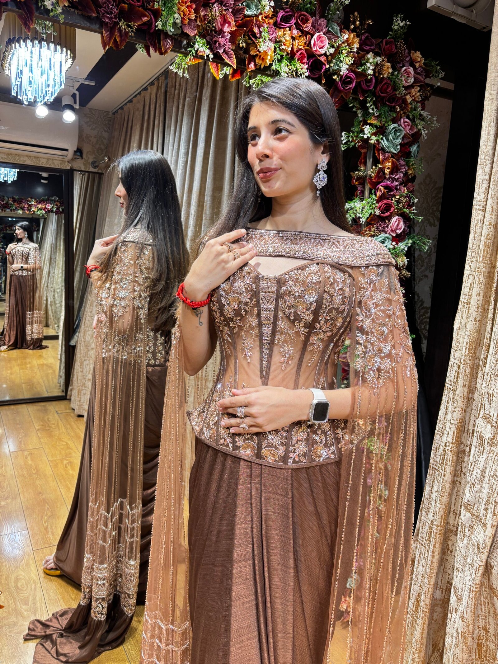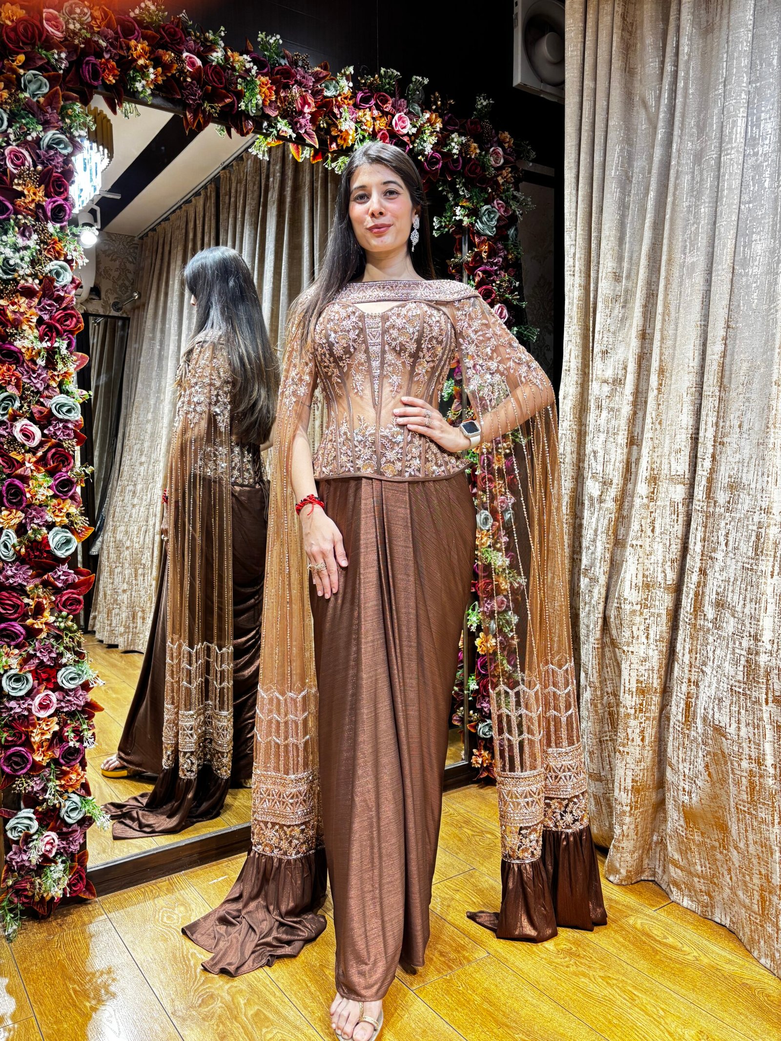 SUNEHRI CLASSY CORSET SET WITH HEAVY BOAT NECK CAPE-BRONZE GOLD