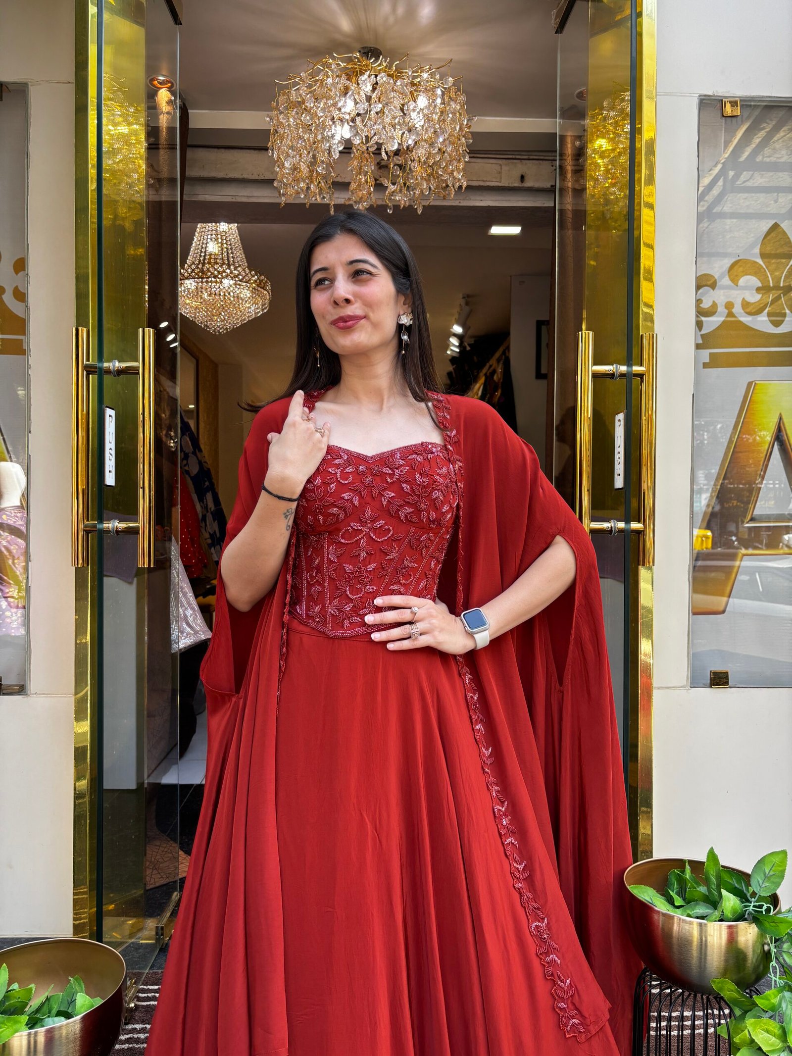 ZARIYA RUST CORSET WITH SKIRT AND CAPE SET